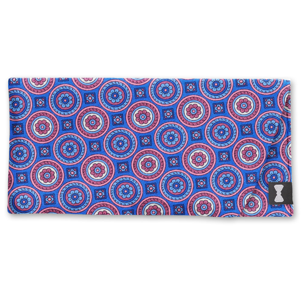 Beautiful round blossom-centered medallions in shades of pink and blue neatly repeat alongside pink and blue squares - all printed on luscious sky-blue Italian silk twill.
