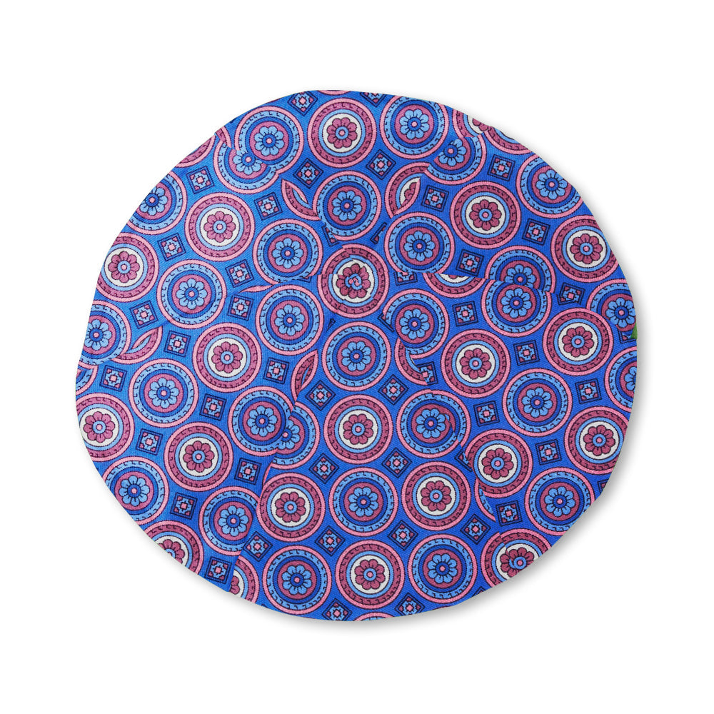 Beautiful round blossom-centered medallions in shades of pink and blue neatly repeat alongside pink and blue squares - all printed on luscious sky-blue Italian silk twill.
