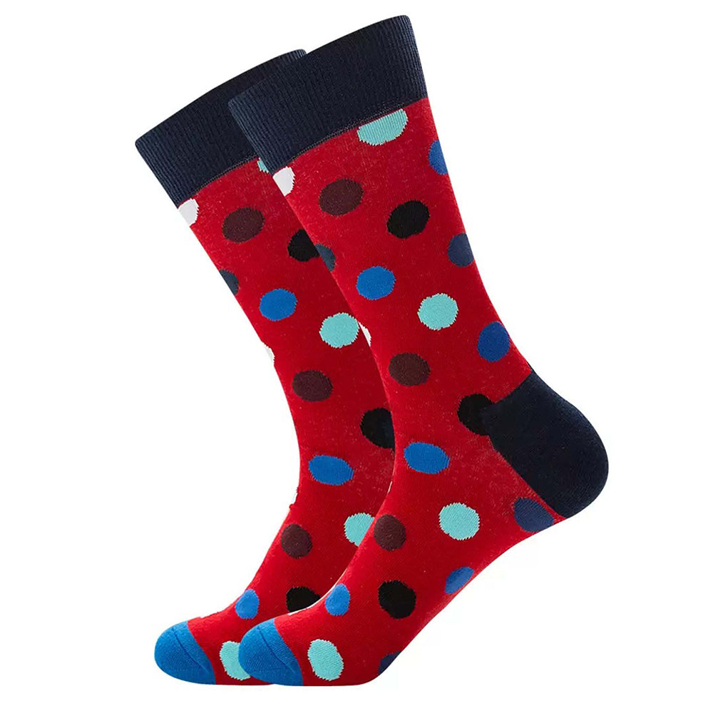 Dark red socks host fat polka dots in shades of blue, white and black as they wend their way from top to toe.