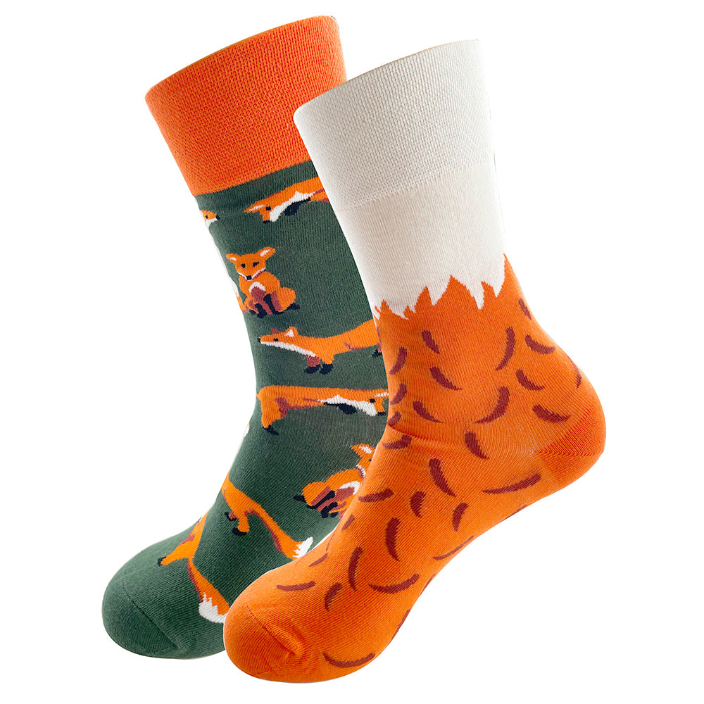 Have some fun wearing this pair of mis-matched crew socks. One is black featuring a litter of fox pups at play. The other could be just the tip of one of their tails.