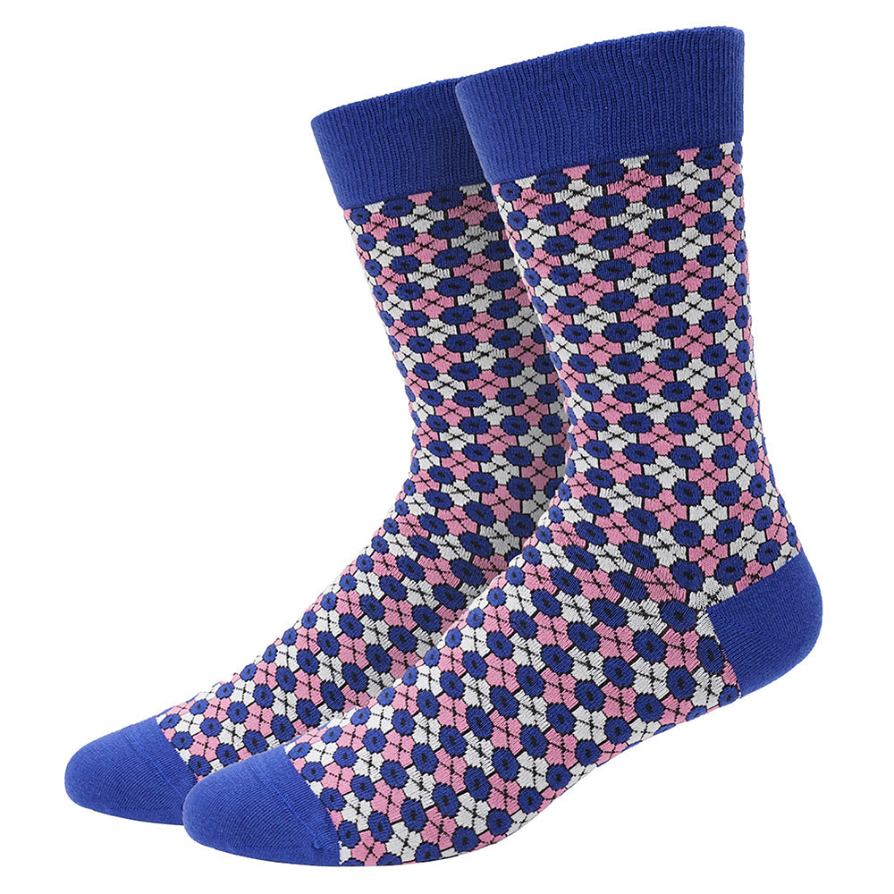 At home with your favorite jeans or an entirely less casual outfit, these engaging socks feature pink and grey squares amid blue hexagons, with blue tops, heels and toes.
