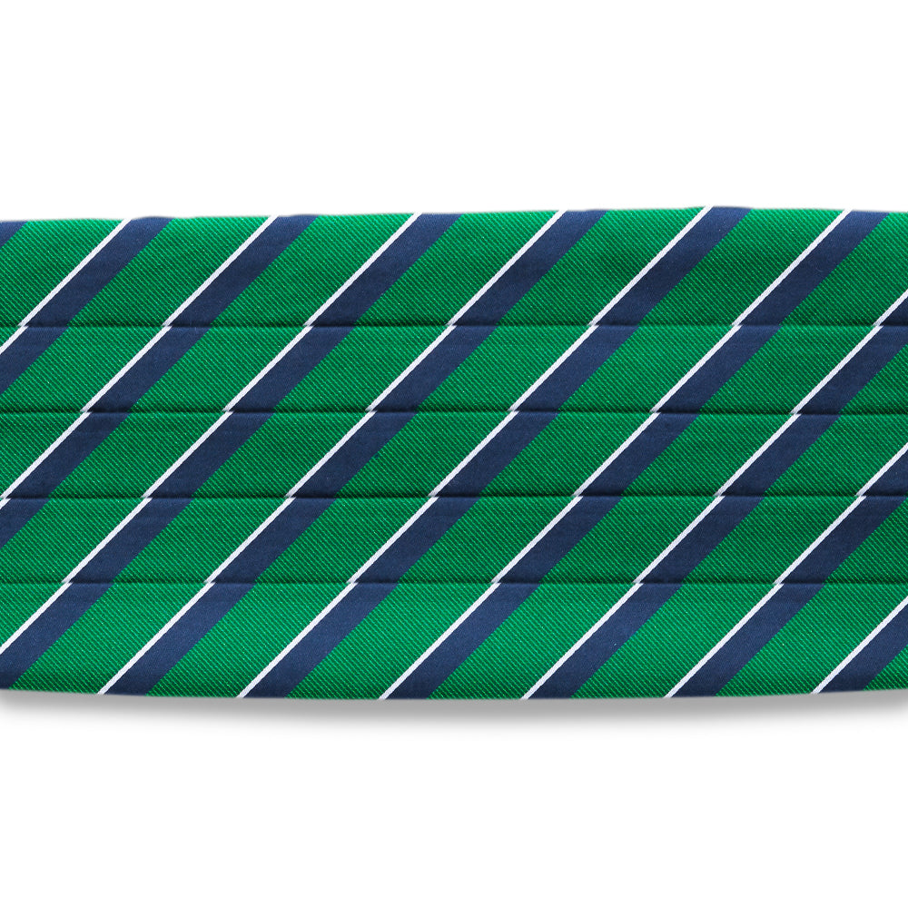 Go anywhere wearing this beautifully woven silk stripe in a classic color combination of dark green and navy blue - highlighted with slim ribbons of white - and catch a few eyes!