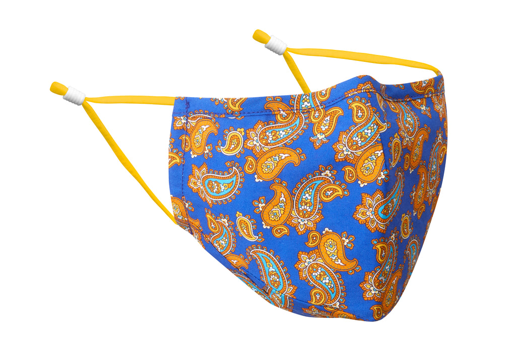This bright blue cotton face mask is dancing with light blue and gold paisleys.