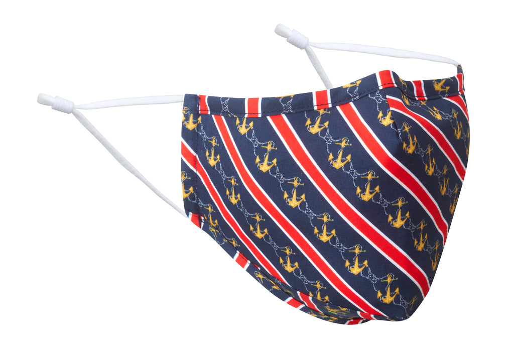 Big brass anchors with lots of looping hawsers are featured on broad bands of navy blue, between trios of red and white in this striking stripe - celebrating the Navy and all of its squids.