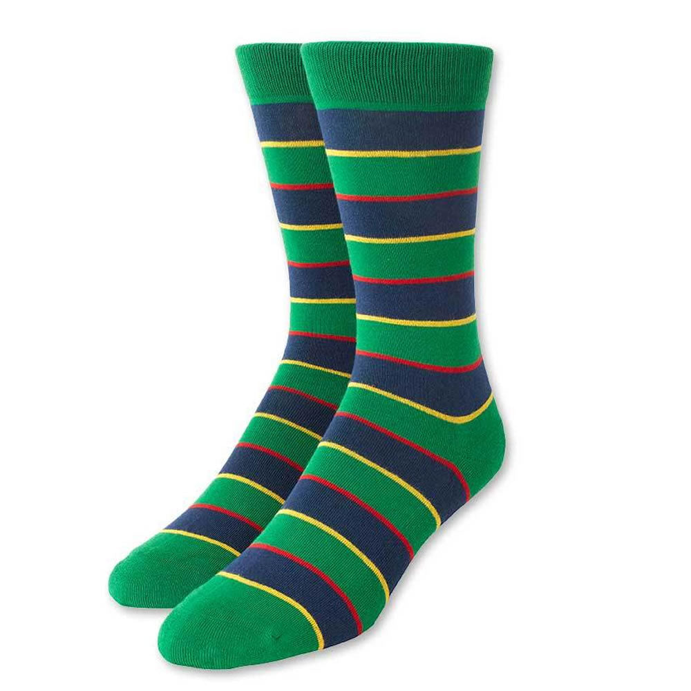 Featuring broad bands of grass green and navy blue bordered with slim ribbons of red and yellow. Green toes, heels and tops.
