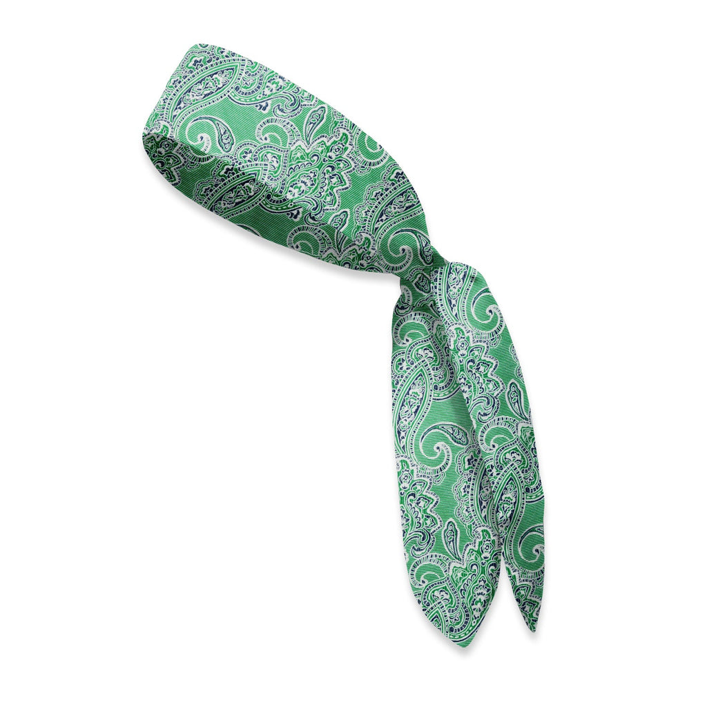 Graceful paisleys of green, blue and silver woven in a gently-ribbed green silk will add a spark of energy and elan to just about any outfit.