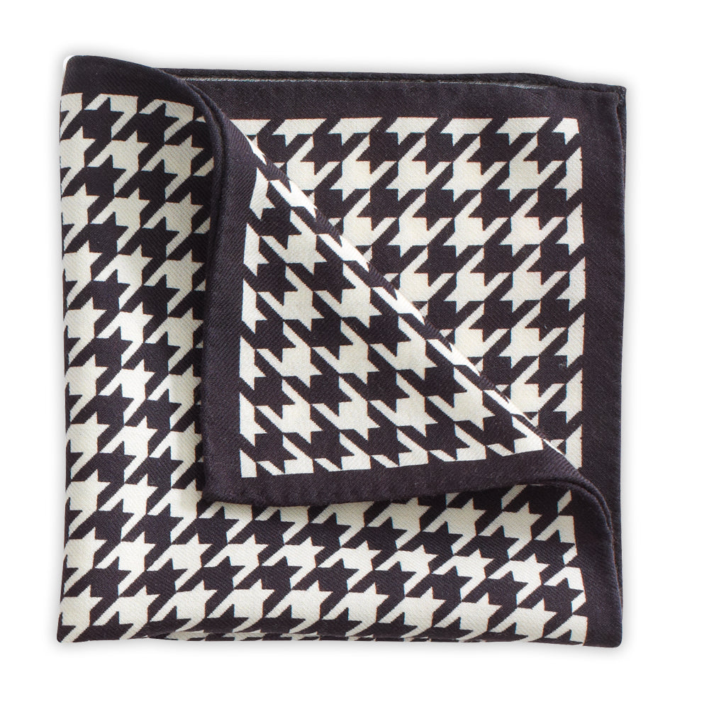 Add just the right final touch to your outfit with this handsome black wool pocket square in a classic houndstooth pattern. Hand-rolled and hemmed. 12" x 12"