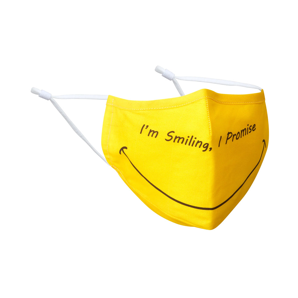 Bright yellow, and totally cheerful, this cotton mask and message will make other folks smile, too.
