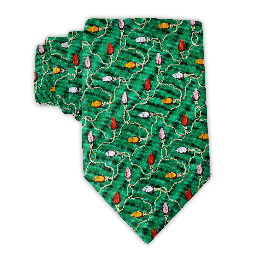An homage to every holiday movie ever that featured decorating misadventures with colored lights, this totally fun design is covered with iconic bulbs on golden wires, all woven in a lightly ribbed green silk.