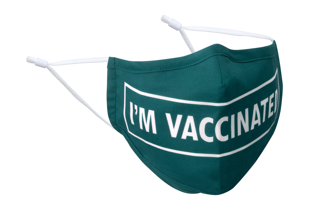 Had your first (and maybe your second) Covid vaccination? Share the good news wearing this green cotton mask with its succinct celebratory message.