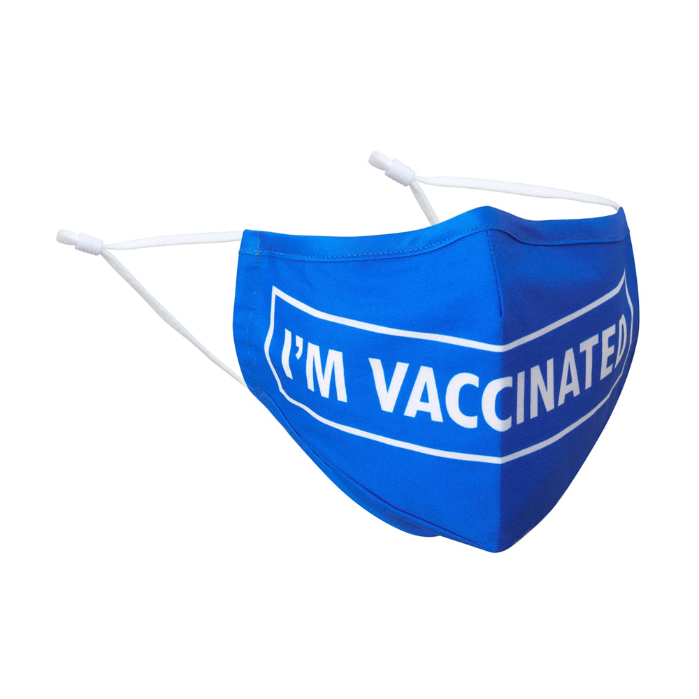 Had your first (and maybe your second) Covid vaccination? Share the good news wearing this royal blue cotton mask with its succinct celebratory message.
