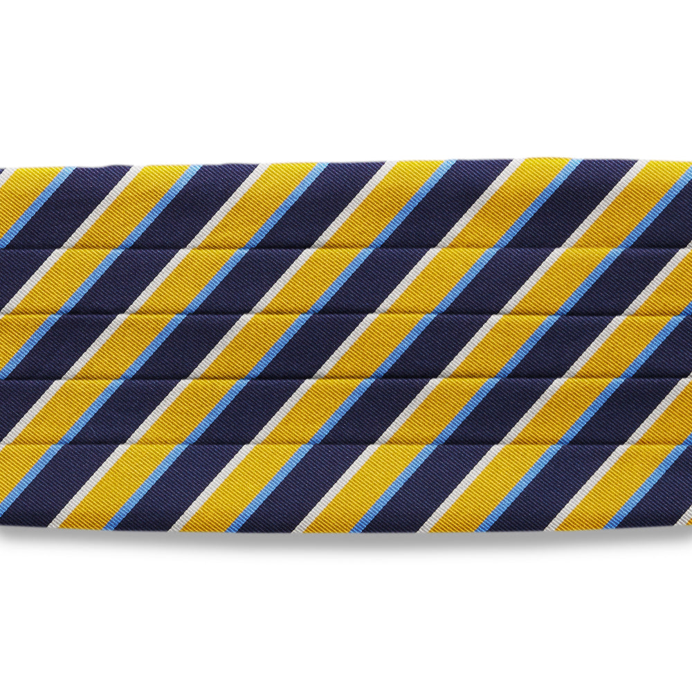 Beautifully ribbed woven silk features bands of gold and navy blue bordered with ribbons of light blue and white. A new classic!