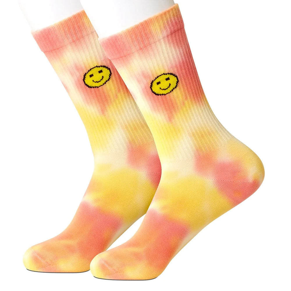 Totally fun pink and gold tie-dye pattern with a smiling yellow happy face on the ribbed top of these socks will make your day - and maybe someone else's, too!