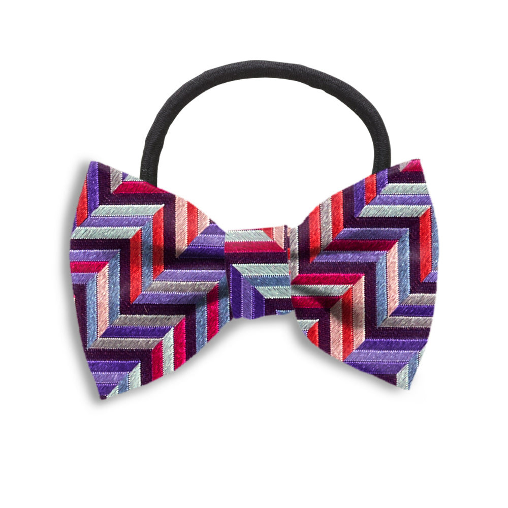 An eye-catching herringbone pattern in shades of purple, blue and pink woven silk is sure to attract only positive attention.