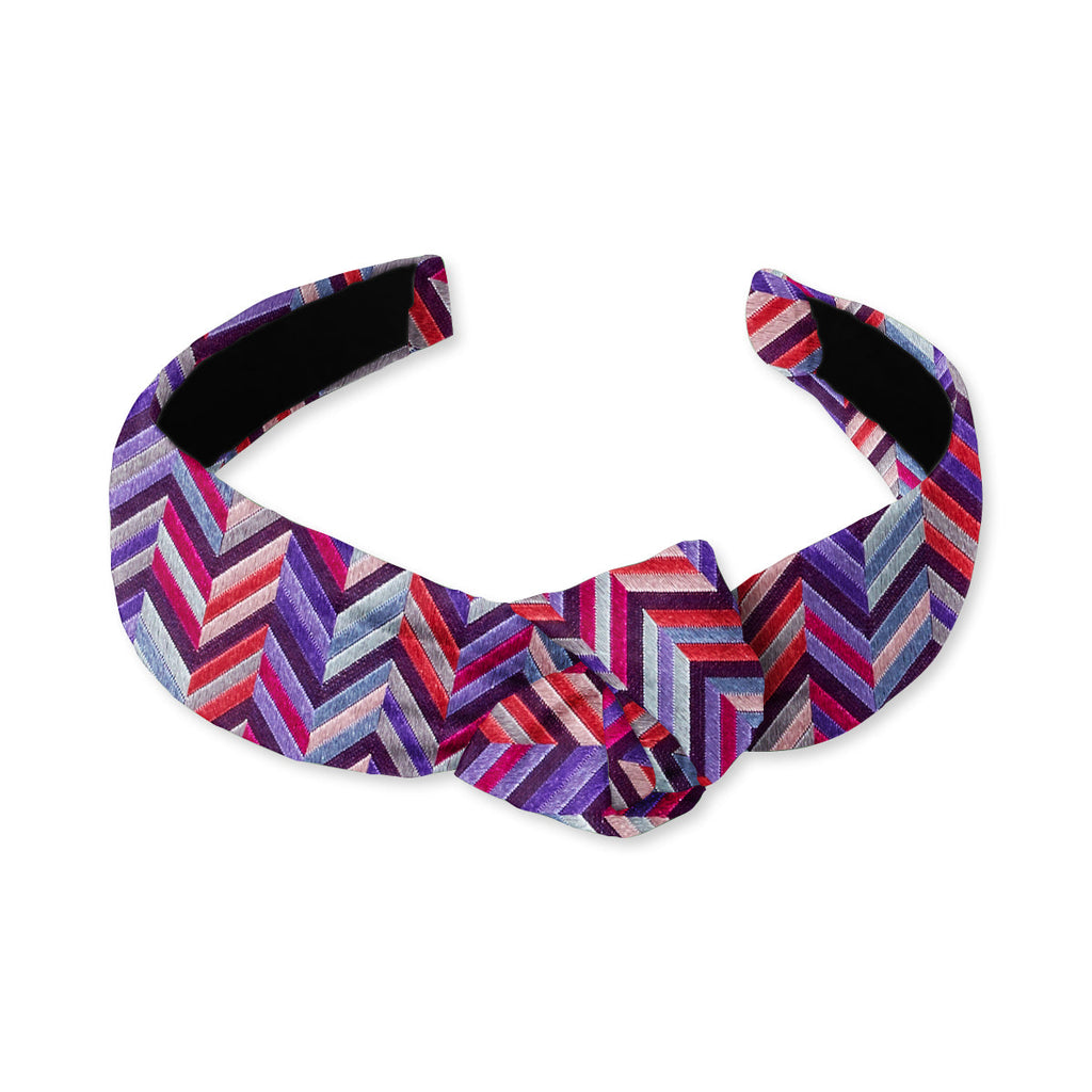 An eye-catching herringbone pattern in shades of purple, blue and pink woven silk is sure to attract only positive attention.