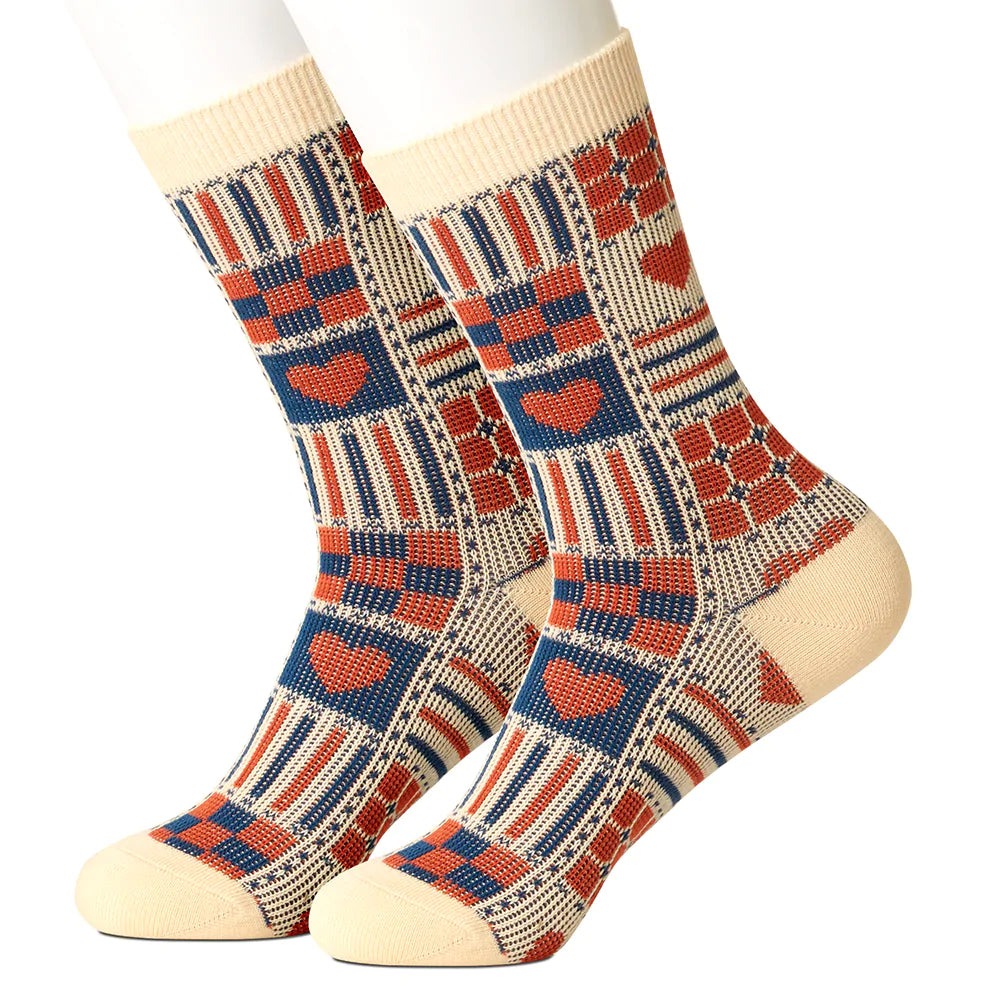 A great choice for Valentine's Day and well beyond, these ivory socks are a patchwork of red and blue squares - many featuring happy red hearts.
