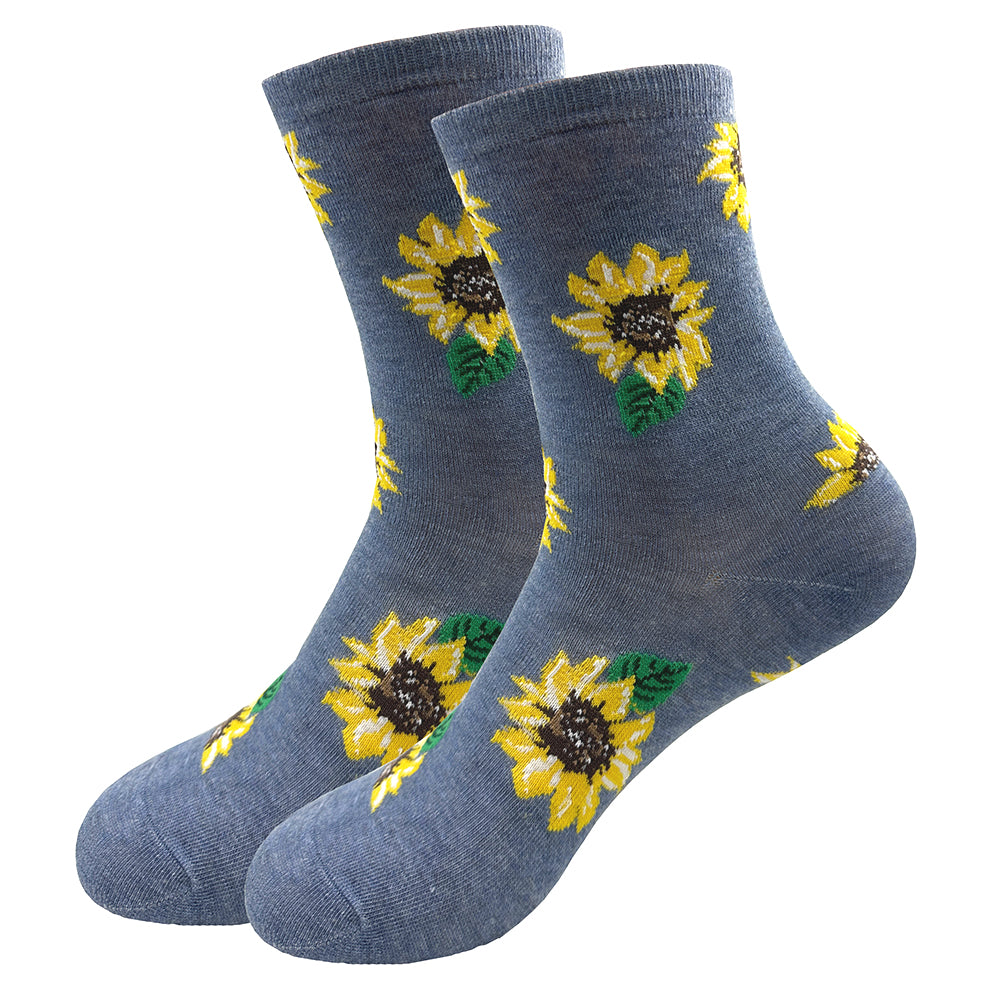 Celebrate the endless appeal of big yellow sunflowers, all gathered on these dusky blue socks.