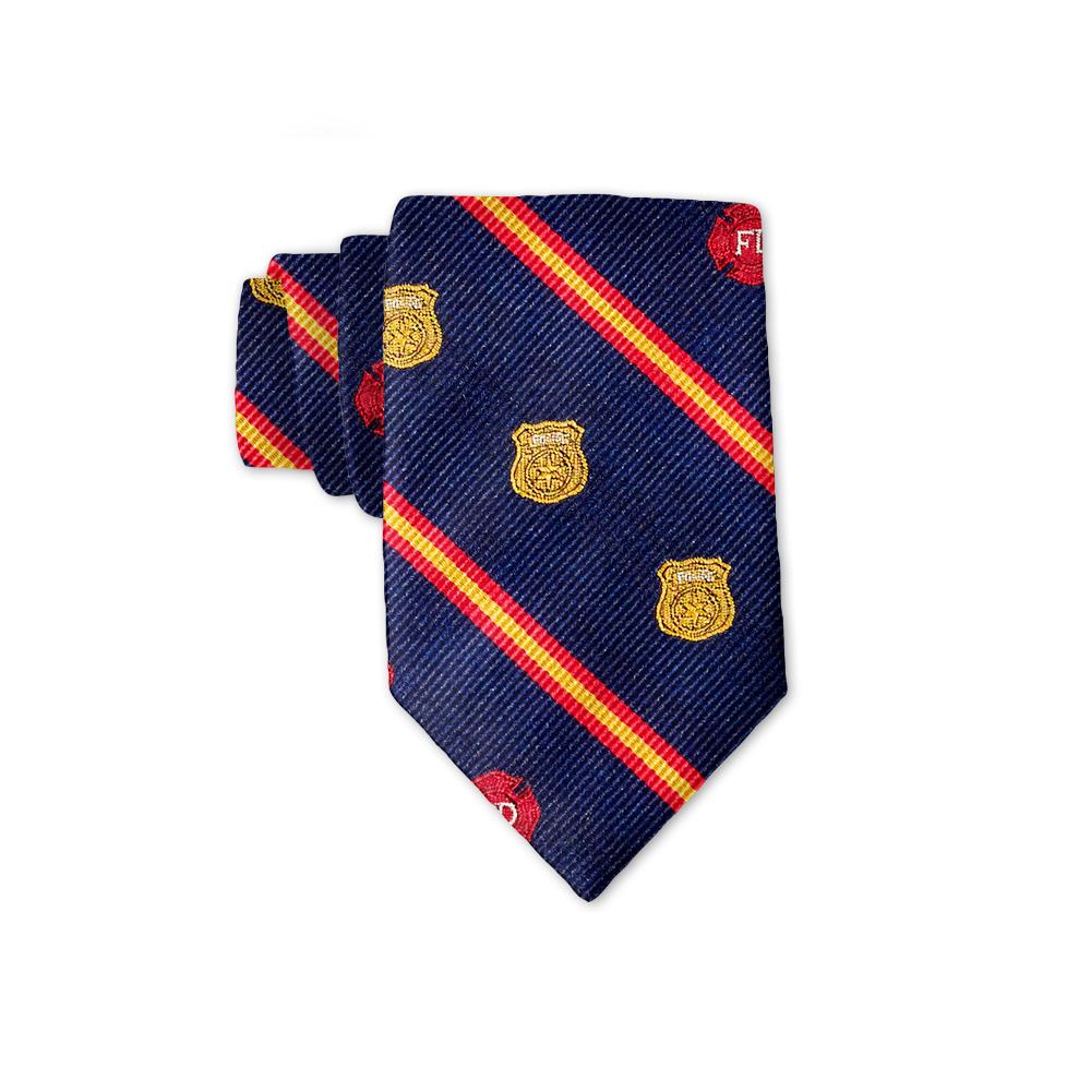 Our hats are off to all the unsung heroes of our communitiesand this navy blue woven silk with Fire Department and Police insignia between red and gold stripes was designed in their honor.