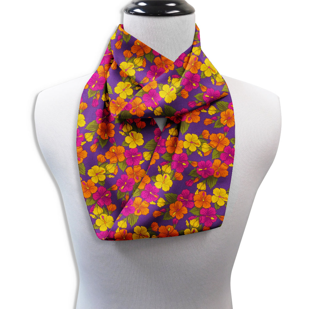 Each scarf is double-sided with a 58 inch circumference and is 6 inches wide. If you've always wanted a silk scarf, the Hibiscus Garden is a great choice!