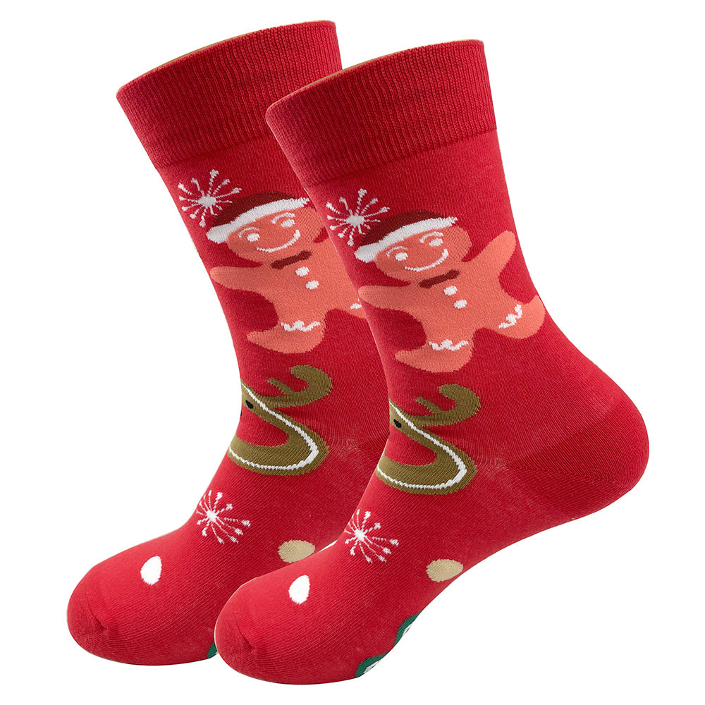 Brightly colored icons of holiday baking - including the all-important gingerbread man - adorn these bright red holiday socks.