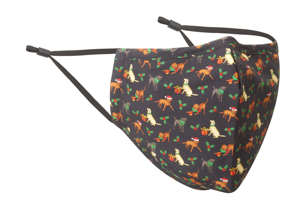 If youre a dog-lover, or just know one, this pack of pups decked out in holiday gear and enjoying the season as they tumble about on black cotton is the ideal face mask for the season!