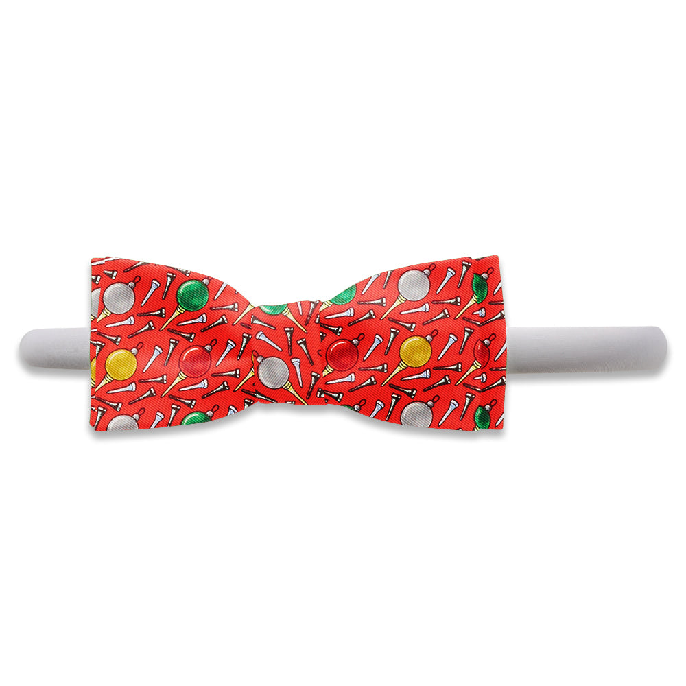 Make a golfer happy with this tongue-in-cheek red silk twill featuring red, green, silver and gold Christmas ornaments atop golf tees. Fore!