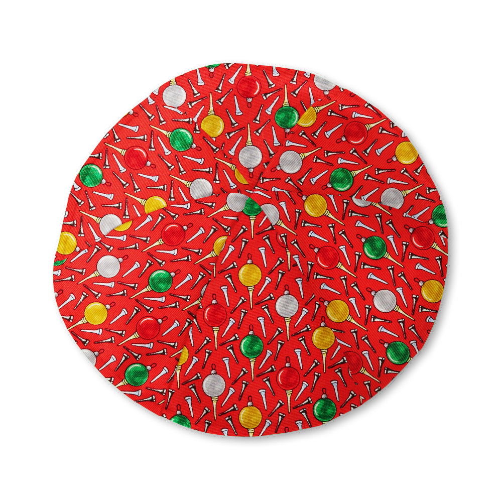 Make a golfer happy with this tongue-in-cheek red silk twill featuring red, green, silver and gold Christmas ornaments atop golf tees. Fore!