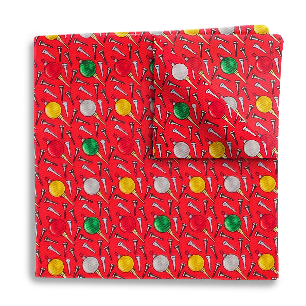 Make a golfer happy with this tongue-in-cheek red silk twill featuring red, green, silver and gold Christmas ornaments atop golf tees. Fore!