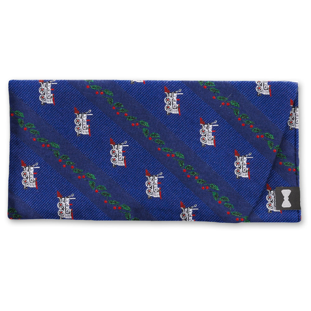 Silver and red toy train locomotives chuff happily along in wide woven bands of blue ribbed silk, enhanced by bright swags of holly on handsome dark blue stripes. This one is a classic.