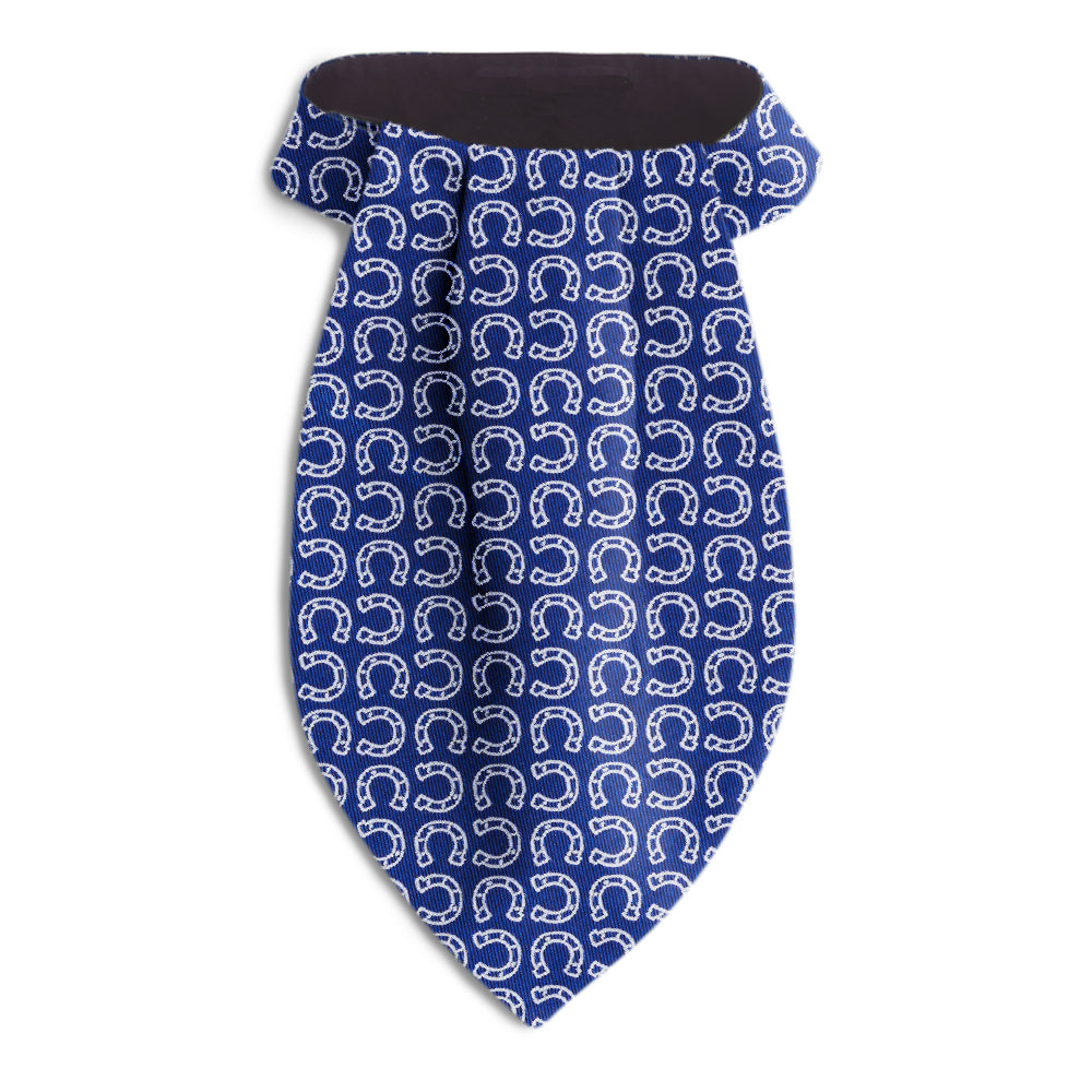 Whether you're all about equines, dressing for a day at the races, headed for a Derby party, or just looking for a bit of good luck, we've got you covered with this repeating pattern of white horseshoes woven in navy blue woven silk.