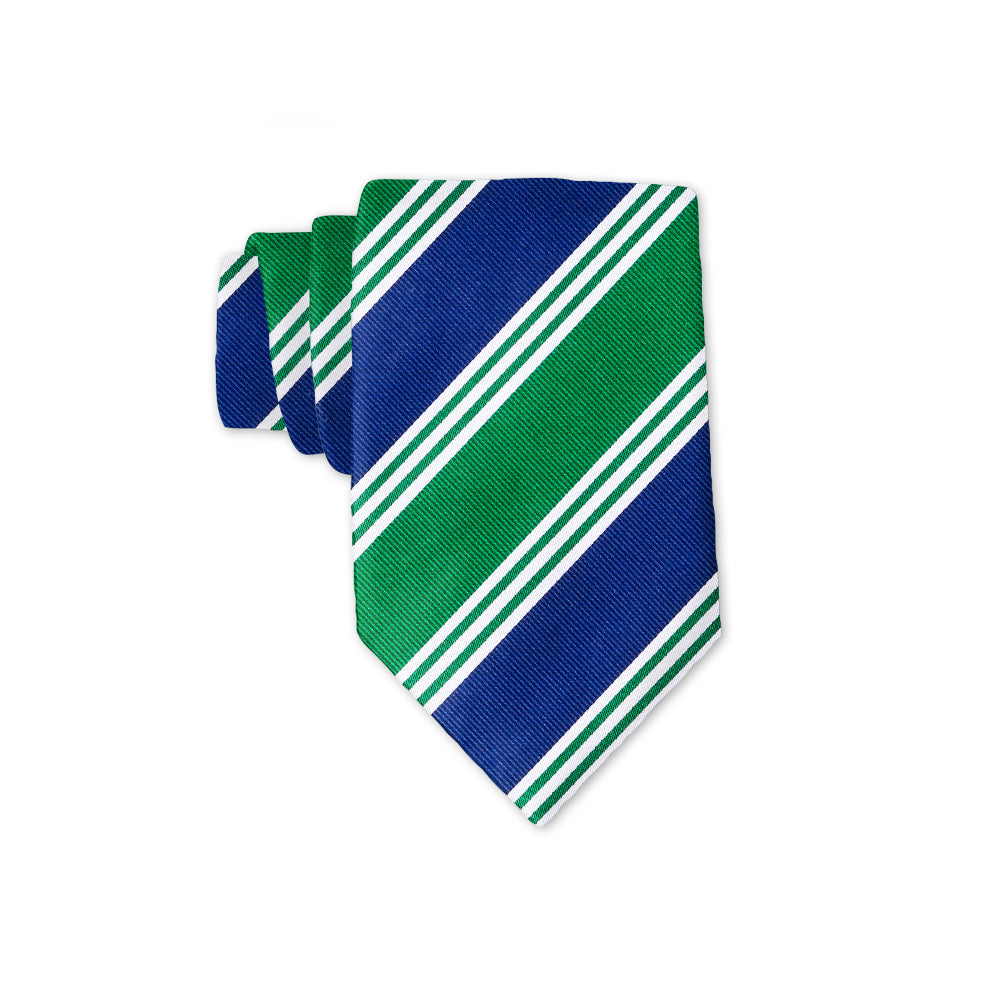 Broad bands of forest green and navy blue are interspersed with quintets of green and white in this handsome woven silk stripe.