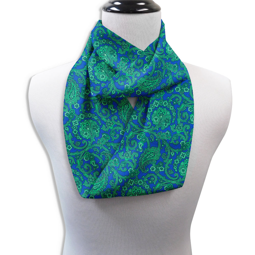 Stand out from the crowd wearing this eye-catching shade of bright blue Italian silk dancing with a fanciful floral and paisley motif in shades of green. Awesome.