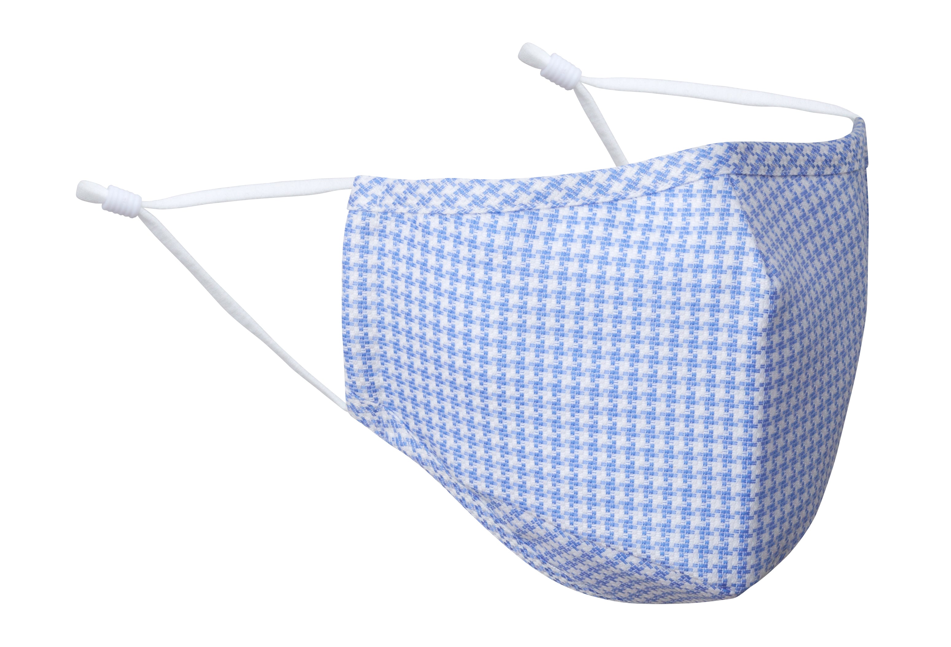 Cover up and look good in this triple-layer, all-cotton face mask featuring a classic houndstooth check pattern in blue and white.