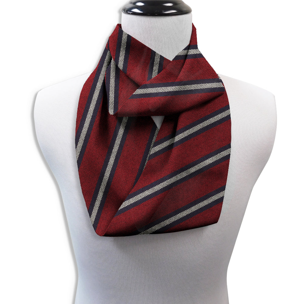Dark red stripes interspersed with trios of navy and white woven in soft warm Italian wool are sure to become one of your cool-weather wardrobe favorites.