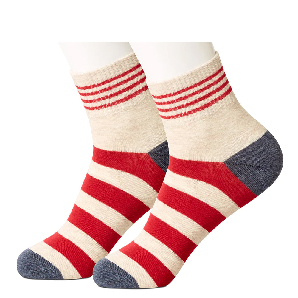 Red and heathery tan stripes of various widths encircle these short crew (or are they tall ankle?) socks with charcoal grey toes and heels.