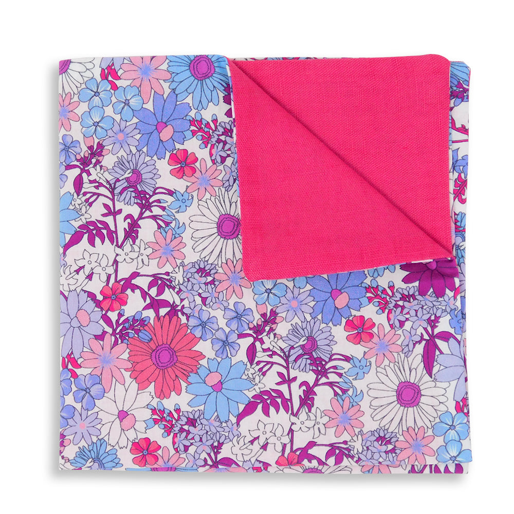 One side of this fully reversible tie features an eye-catching floral design in shades of pink, blue and purple on white cotton; the other a complimentary shade of dark pink. Wear it any way you like!