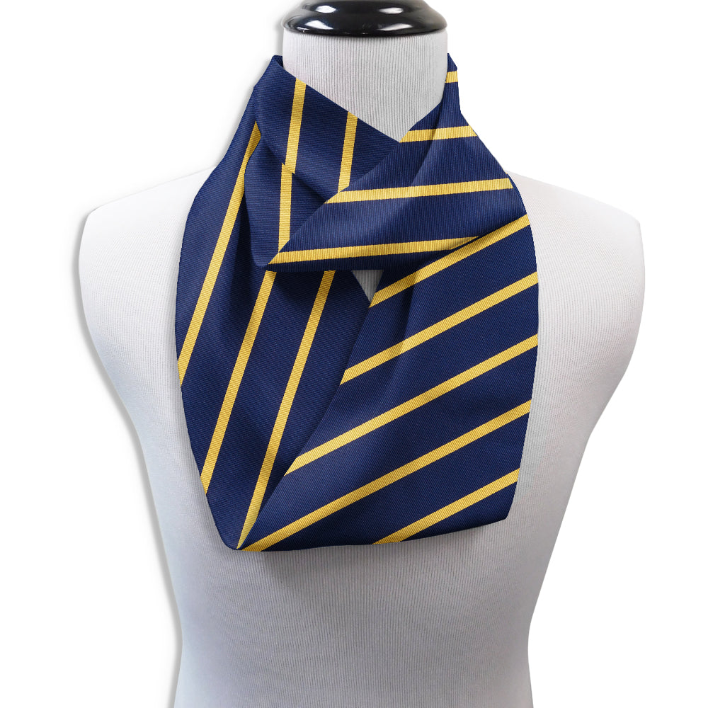 A handsomely ribbed woven silk stripe featuring broad bands of navy blue and ribbons of gold.