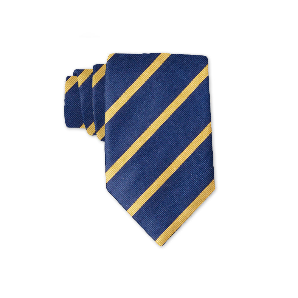 A handsomely ribbed woven silk stripe featuring broad bands of navy blue and ribbons of gold.