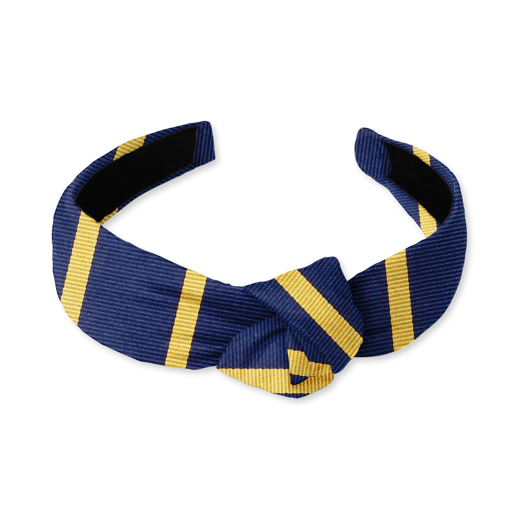 A handsomely ribbed woven silk stripe featuring broad bands of navy blue and ribbons of gold.