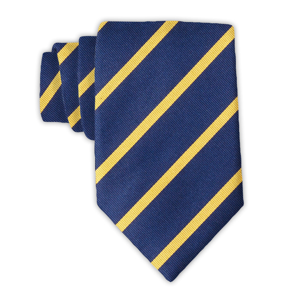 A handsomely ribbed woven silk stripe featuring broad bands of navy blue and ribbons of gold.