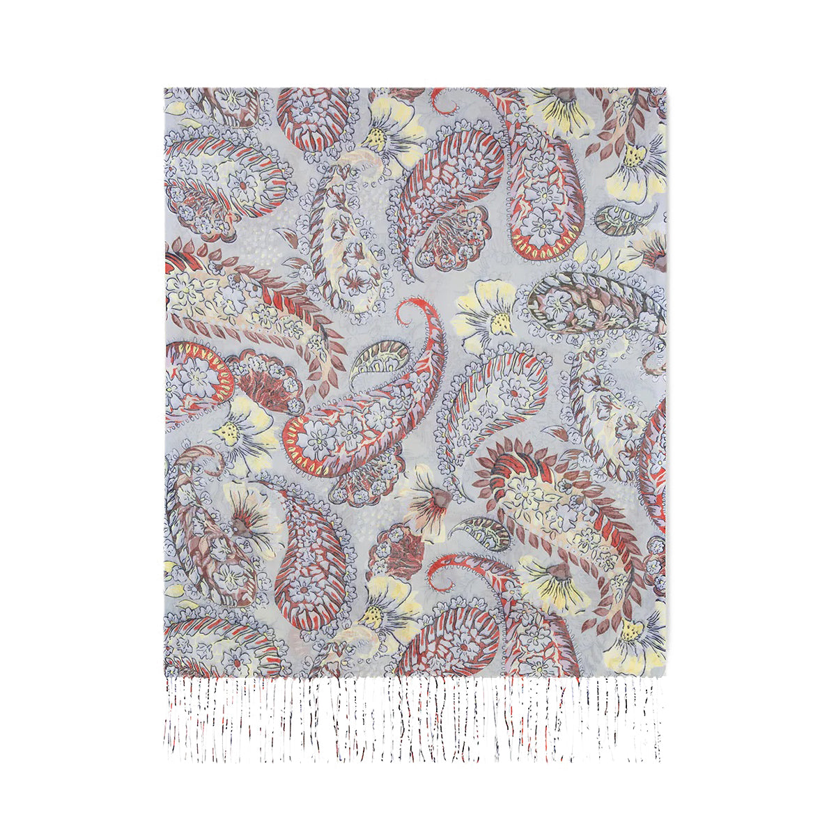 Beautiful orange and brown paisleys, amidst a variety of light yellow blooms, dance on a silver-grey background.