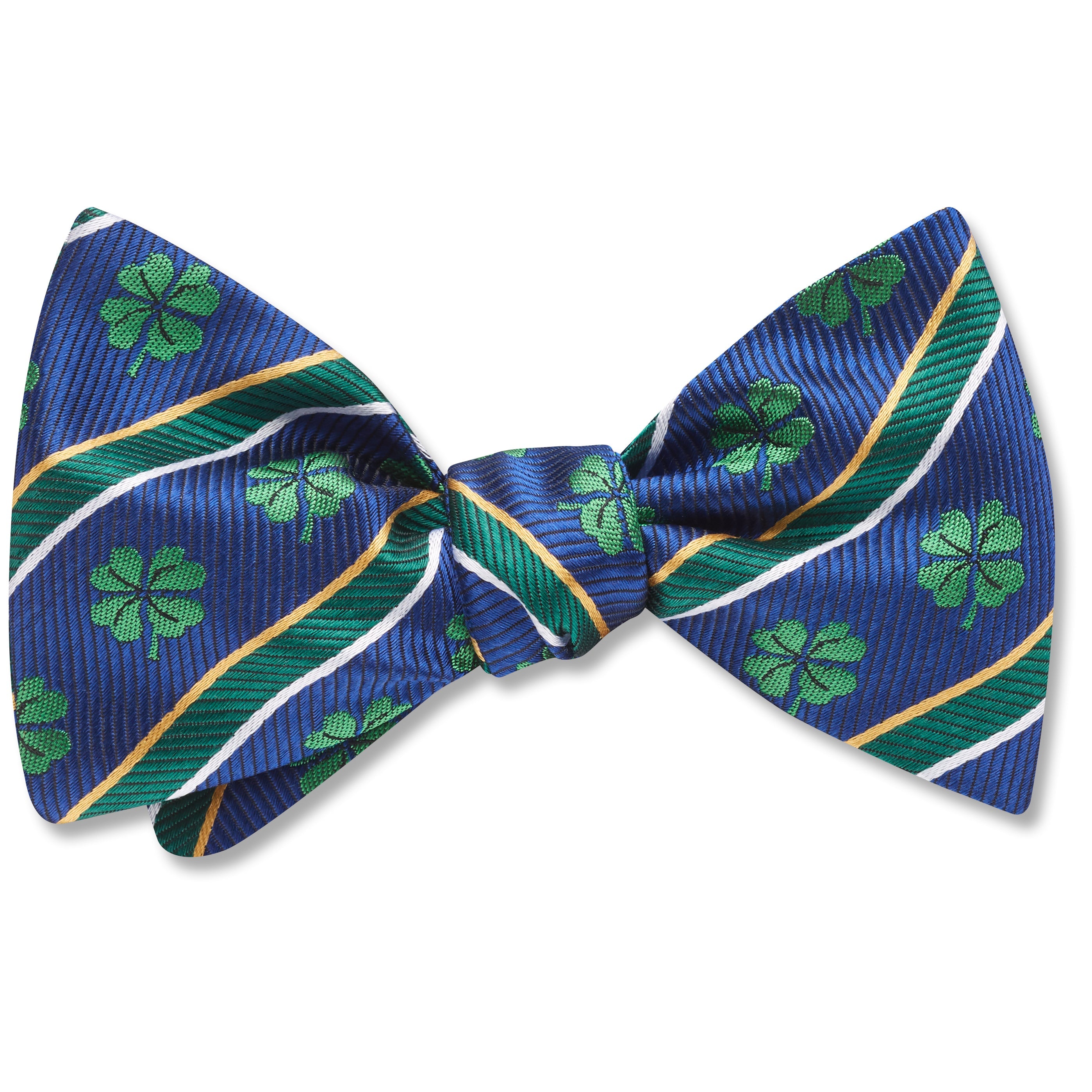 Striped trios of green, white and gold border broad bands of dark blue woven silk and a plethora of lucky four-leaf clovers. Wear it all year 'round.