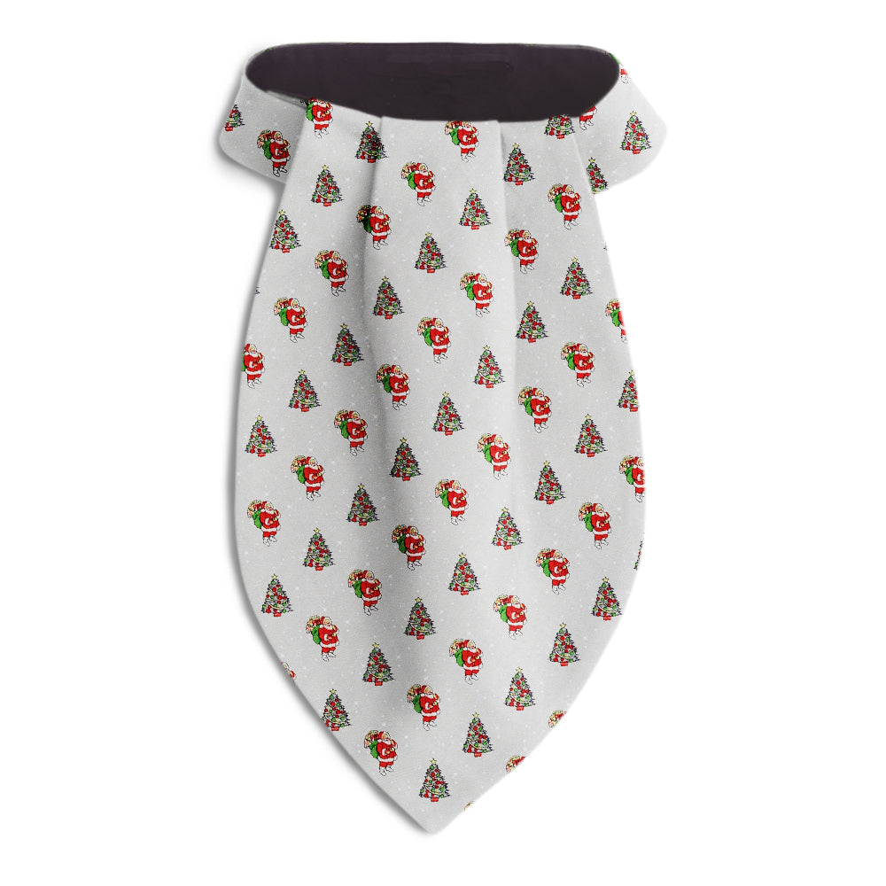Cool silvery grey silk twill with snow falling gently in the backgroundalong with well decorated trees and a jolly old fellow in red with a pack on his backmakes a great holiday choice!