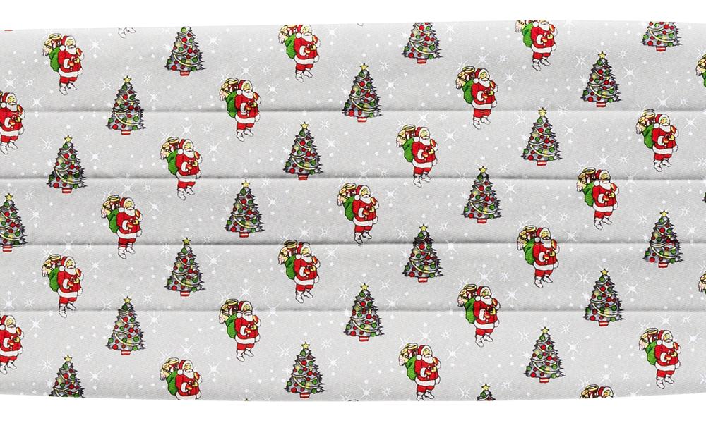 Cool silvery grey silk twill with snow falling gently in the backgroundalong with well decorated trees and a jolly old fellow in red with a pack on his backmakes a great holiday choice!