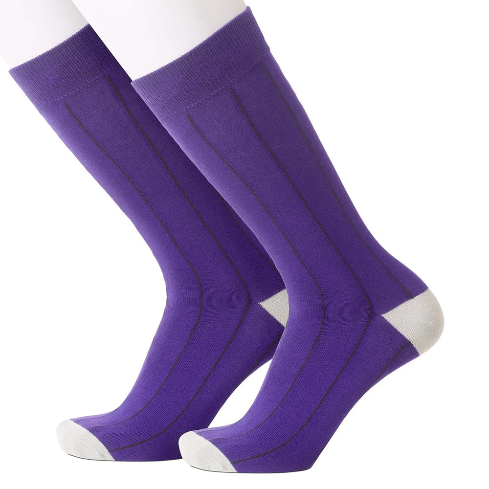 Slender stripes of black run the full length of these bright blue socks with their grey heels and toes.
