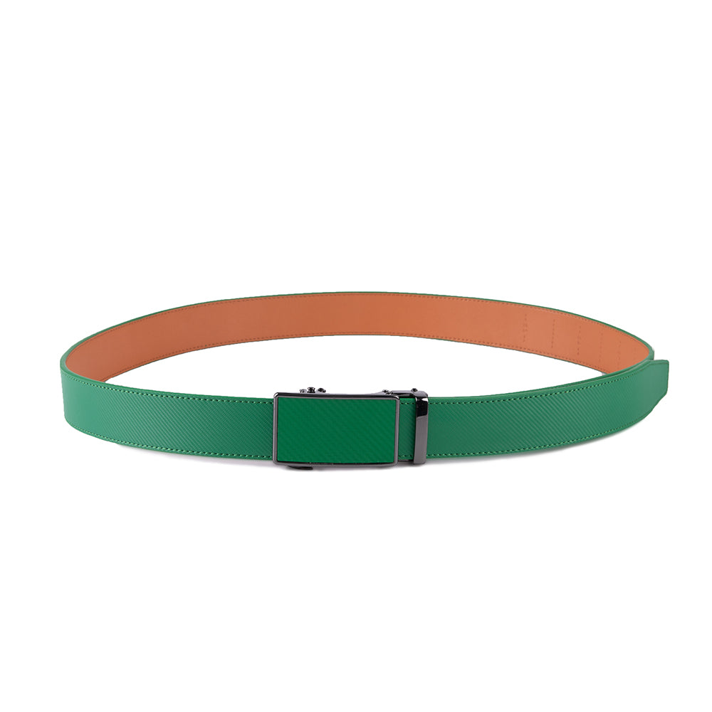 Practical and handsome, this bright green leather belt is finished with zinc alloy hardware with a textured buckle top in the same color as the belt itself.