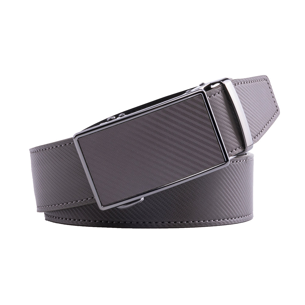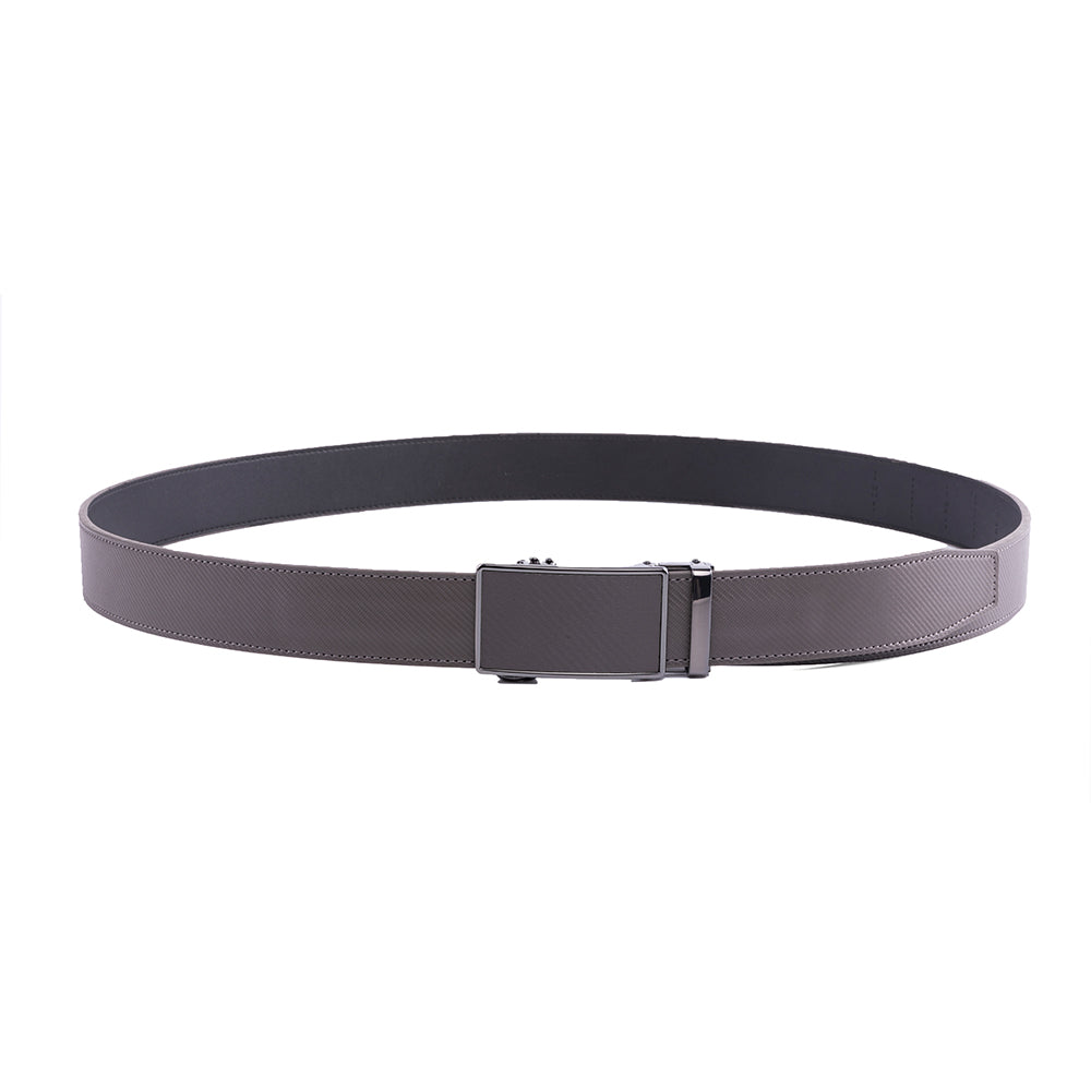 Practical and handsome, this charcoal grey leather belt is finished with zinc alloy hardware with a textured buckle top in the same color as the belt itself.