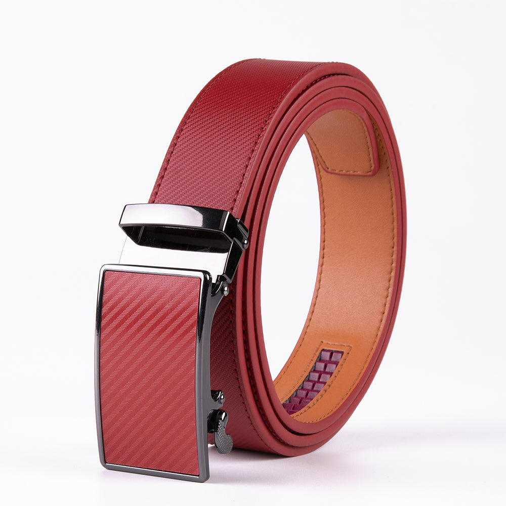 Practical and handsome, this wine red leather belt is finished with zinc alloy hardware with a textured buckle top in the same color as the belt itself.