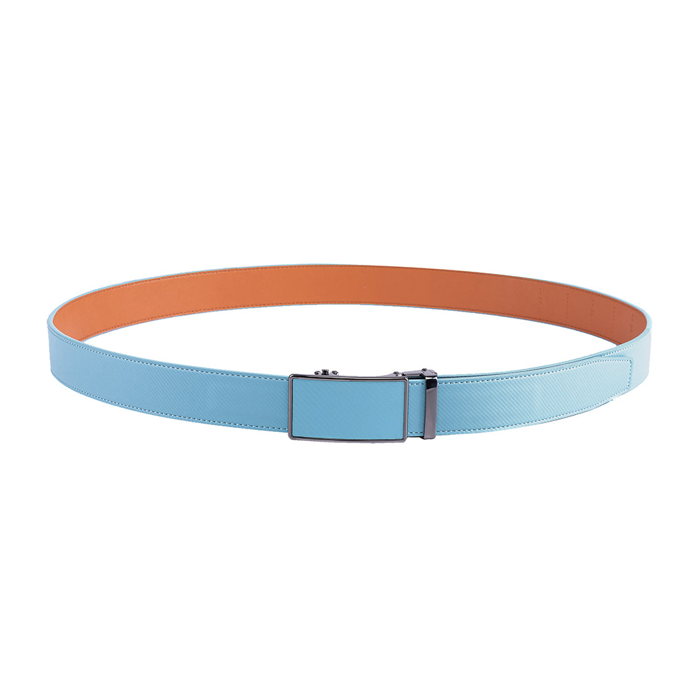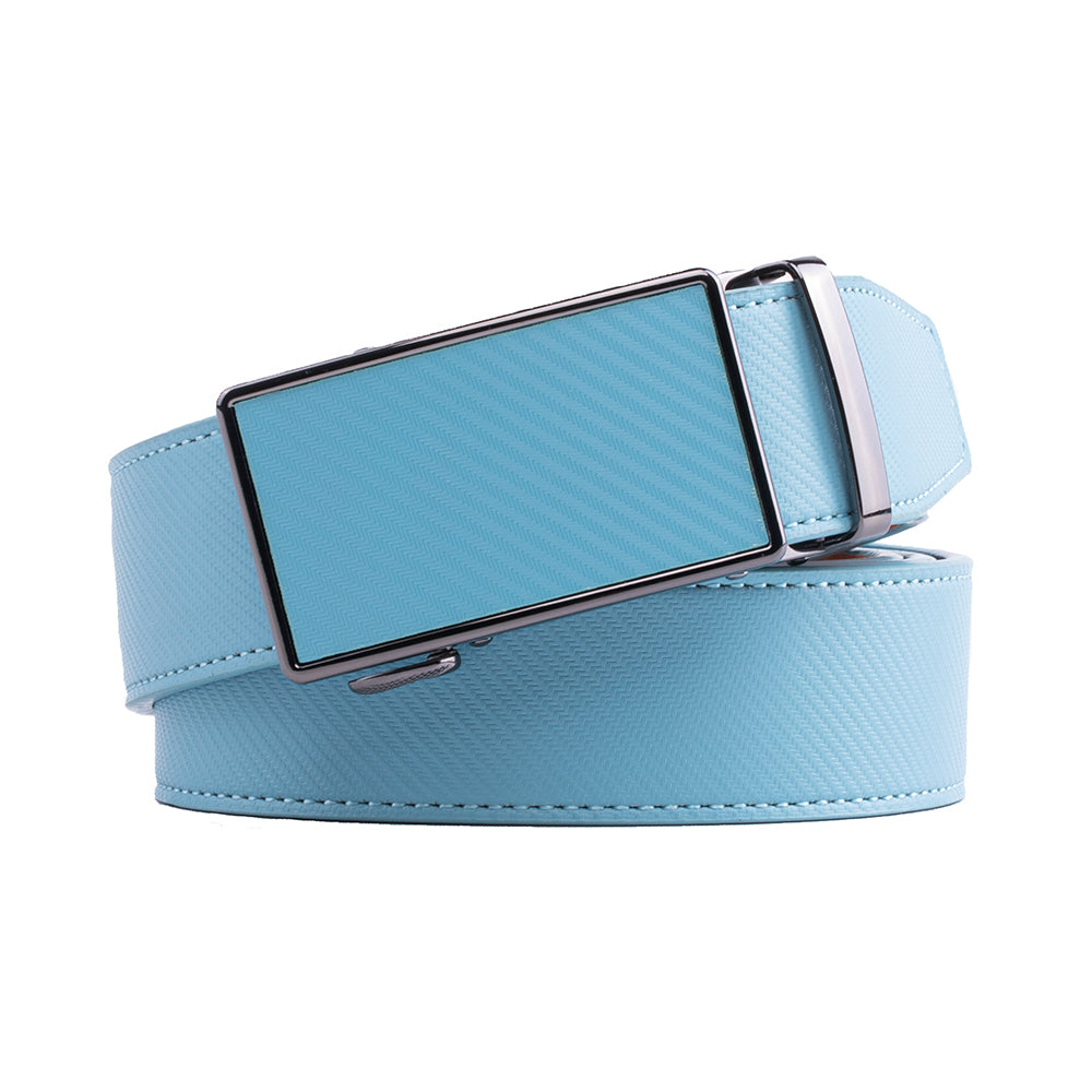 Practical and handsome, this light blue leather belt is finished with zinc alloy hardware with a textured buckle top in the same color as the belt itself.