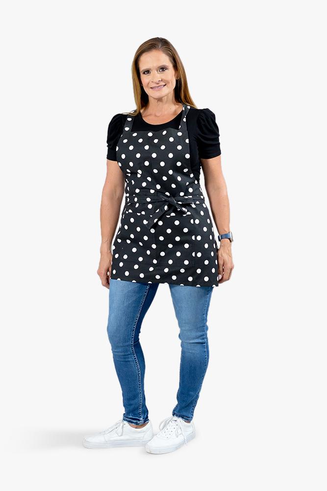 This might be an apron's take on the little black dress … simple and perfect white dots on black.